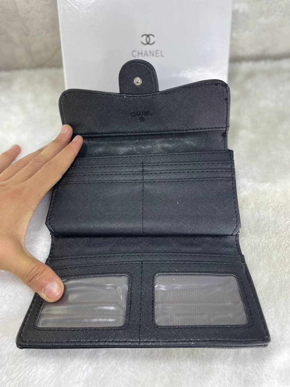 هاد المحفظة من Chanel ستايل راقي وكلاسيكي، بالجلد المبطّن على شكل مربعات وشعار الدار الذهبي من قدّام كيزيدها لمسة ديال الأناقة. من الداخل فيها تنظيم مزيان: فتحات بزاف للكارتات، جيوب للفواتير، وجوج نوافذ شفافة للبطاقة الوطنية أو الرخصة باش تبان بسهولة بلا ما تخرّجيها. السدّة ديالها مغناطيسية كتسد مزيان وما كتتحلّش بوحدها، والخامة باينة مقاومة للاستعمال اليومي وتّتحافظ على الشكل ديالها. الحجم مناسب للحقيبة وما كيّاخدش بلاصة كبيرة، ومناسبة حتى كهدية حيث كتجي مع العلبة الأنيقة ديال Chanel. إلا بغيتي فيديو قصير ولا قياسات مضبوطة نوفّروه فالحين باش تختاري على خاطرك.