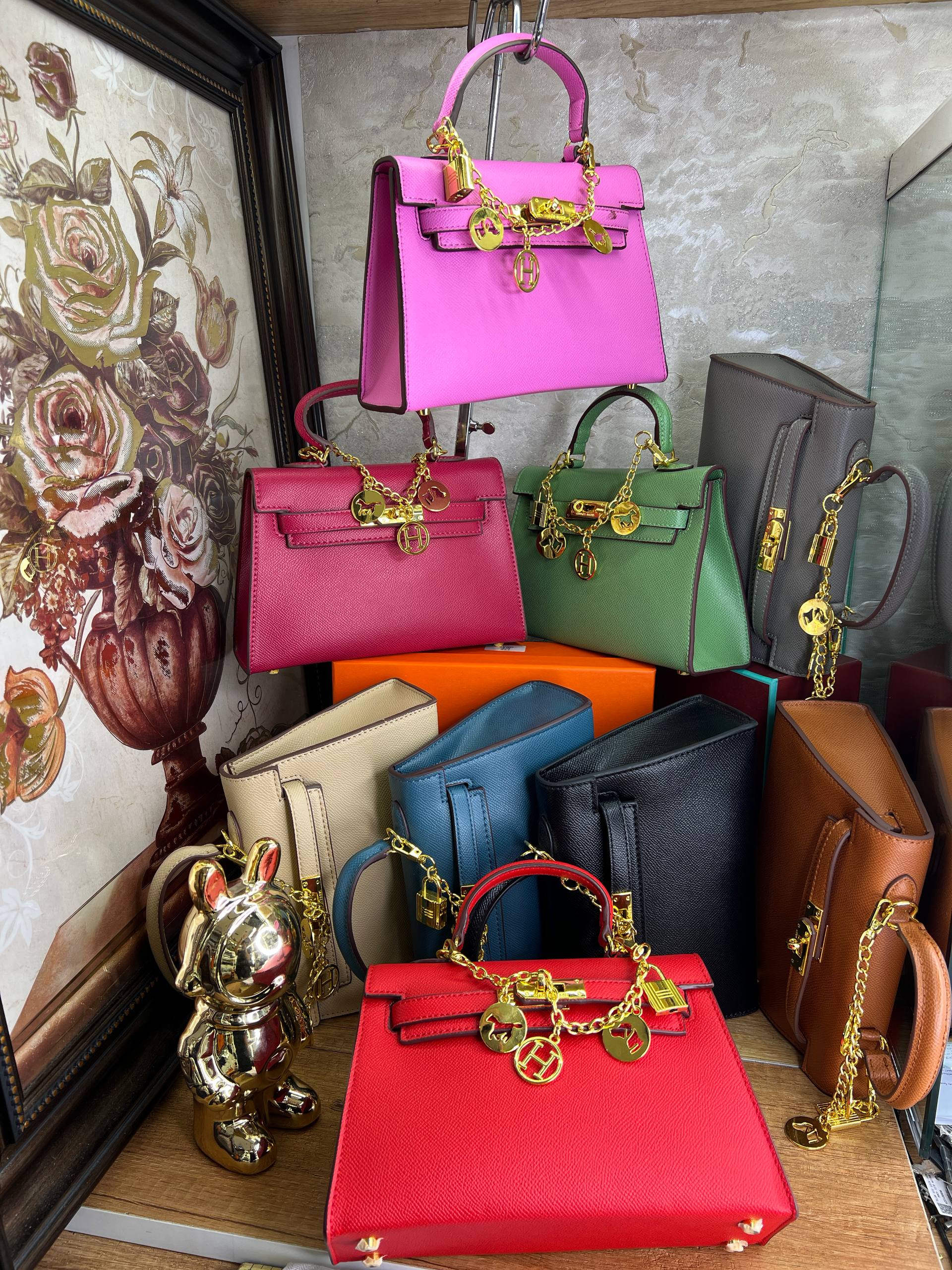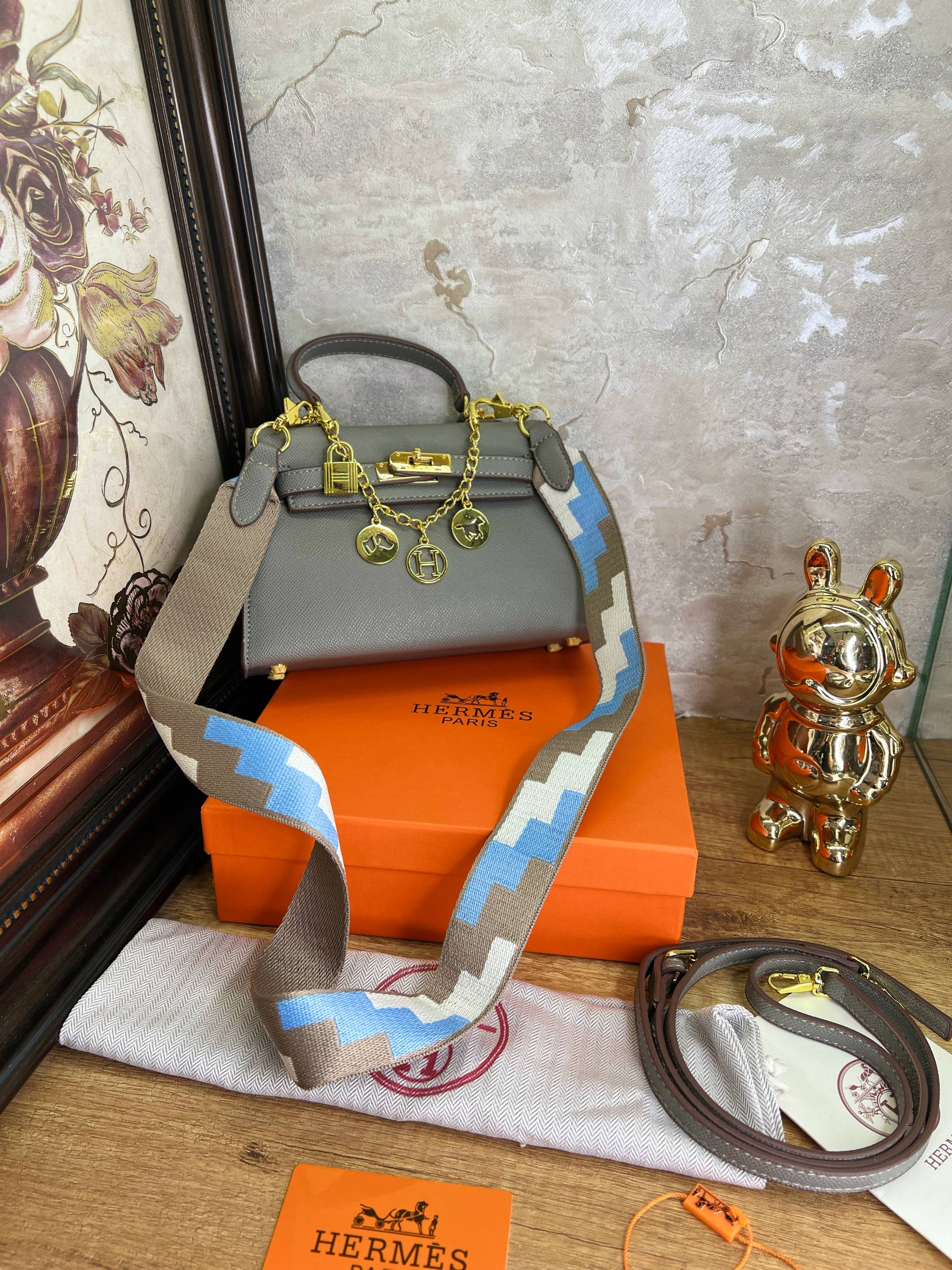 حقيبة أنيقة بتصميم كلاسيكي بمقبض علوي وإقفال أمامي مع تشطيبات ذهبية، كتجي مع جوج ديال السيور: سير جلدي طويل للحمل على الكتف أو كروس، وسير قماشي عريض بنقشة هندسية لتغيير اللوك بسهولة. الجلد المحبّب قوي ومقاوم للخدوش، والحجم عملي مع تقسيم داخلي مُرتّب باش كلشي يبقى منظم. مناسبة للمناسبات والخرجات اليومية، وكتجي مع البوكس البرتقالي الأيقوني باش تكون جاهزة للإهداء