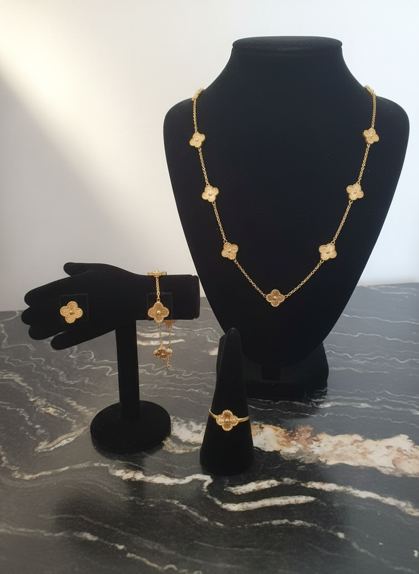 Découvrez un ensemble harmonieux composé d’un collier long, d’un bracelet, d’une bague et de boucles d’oreilles assorties. Chaque pièce a été conçue pour sublimer votre allure avec élégance et finesse. Le collier long apporte une touche sophistiquée en allongeant la silhouette, tandis que le bracelet et la bague complètent le look avec délicatesse. Les boucles d’oreilles équilibrent l’ensemble, offrant un style cohérent et raffiné, idéal pour toutes les occasions où vous souhaitez affirmer votre goût pour les accessoires de qualité.